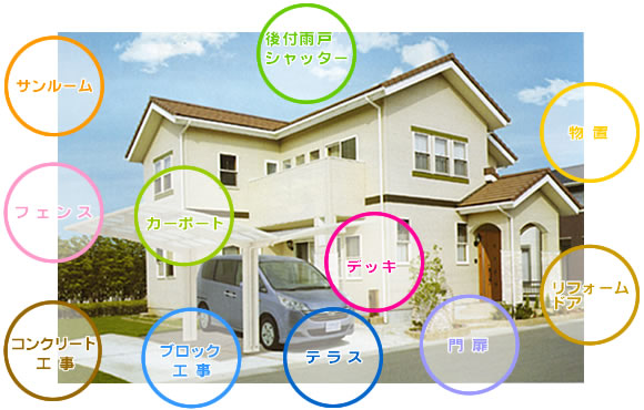 その他、カーポート・テラス・フェンス・門扉・物置・リフォームドア・雨戸・シャッター・ブロック工事・コンクリート工事・・・・エクステリア関連何でもOKだそうです。
